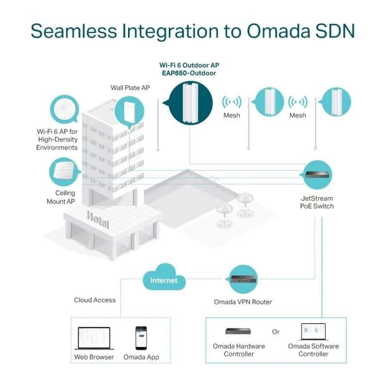 2 Cobertura de largo alcance: amplificador de alta potencia dedicado y antenas profesionales con una carcasa resistente a la intemperie IP67. Tecnología Omada Mesh: permite la conectividad inalámbrica entre los puntos de acceso para un alcance extendido y una implementación flexible. 3 Manténgase fluido con la itinerancia continua: los usuarios pueden disfrutar de una transmisión continua en toda la propiedad con sus dispositivos cambiando sin esfuerzo entre los puntos de acceso.