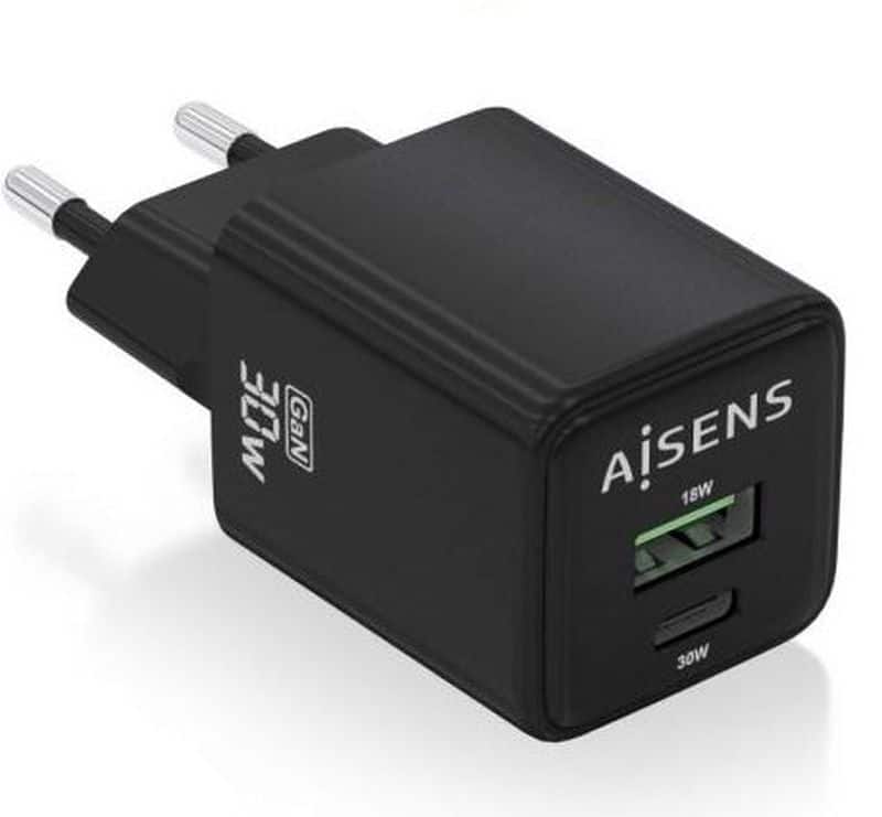 AISENS CARGADOR GAN DE PARED ASCH-30W2P038-BK/ 30W/ 1XUSB/ 1xUSB-C / NEGRO