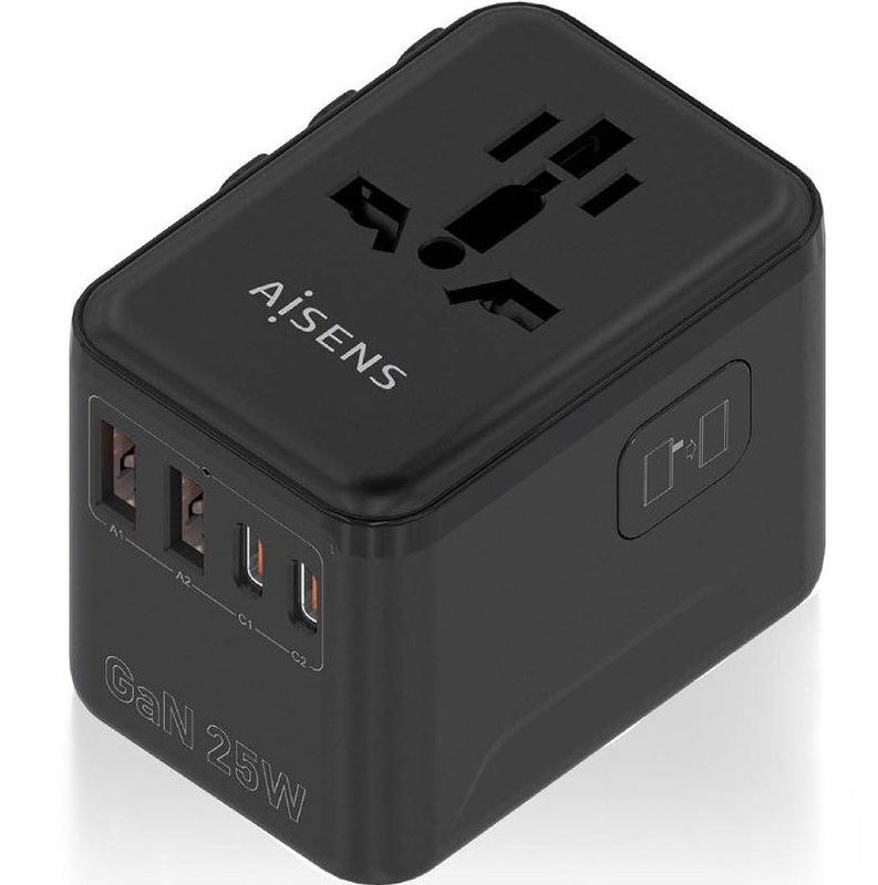 AISENS – ADAPTADOR ENCHUFE UNIVERSAL PARA VIAJE EU/USA/UK/AU CON CARGADOR USB GaN, 2xUSB-A QC3.0, 2xUSB-C PD3.0 25W, NEGRO Este adaptador universal de viaje todo-en-uno es ideal para viajeros internacionales, funcionando en más de 200 países y regiones. Con 4 tipos de enchufes (Tipo C, G, A, I) y la capacidad de cargar hasta 4 dispositivos simultáneamente, es perfecto para quienes necesitan cargar sus dispositivos en diferentes países. Adaptador Universal de Viaje Todo-en-Uno: Compatible con más de 200 países y regiones, incluye 4 tipos de enchufes: Tipo C (Francia, Alemania, Italia, España, etc.), Tipo G (Reino Unido, Hong Kong, Dubai, etc.), Tipo A (EE.UU., Japón, México, etc.) y Tipo I (China, Australia, Argentina, etc.).