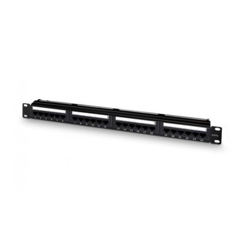 Panel de parcheo de 24 puertos para conexión RJ45 Cat.6 UTP. Sistema de inserción: dual IDC. Código de colores T568A y T568B.