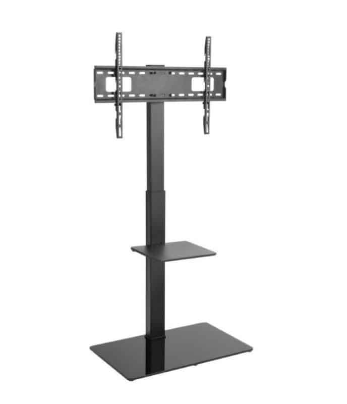 Especificaciones: Soporte de suelo eco con bandeja DVD para monitor/TV de 37 -70 Fabricado con acero de alta resistencia y pintado con pintura electrostática para un acabado perfecto. La base del soporte está fabricado con cristal templado de alta resistencia Compatible con los televisores con sistema de montaje VESA, incluyendo la mayoría de los modelos de televisores Samsung gracias a los accesorios especiales suministrados con el kit de montaje. VESA Máximo: 600x400mm (Compatible con VESA de 200×200,300×200,300×300,400×200,400×300,400×400,600x400mm) Carga Máxima: 40kg Angulo de giro: -35 / +35 Altura máxima del soporte: 1458mm Rango de ajuste para la altura del soporte TV: ajustable entre 1342 y 1458mm Tamaño de bandeja DVD: 260 x 300mm Tamaño de base del soporte: 400 x 650mm Color: Negro Contenido 1 x Soporte de suelo para monitor/TV 1 x Kit de montaje (No incluye herramientas) 1 x Manual de instrucciones multi idioma