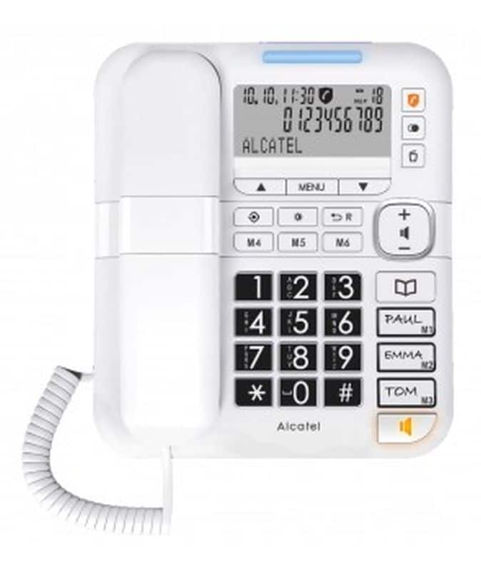 ALCATEL TELEFONO FIJO COMPACTO TMAX70 BLANCO Funciones: Manos libres 6 teclas de memorias directas (números) con imagen integrable Teclado con grandes teclas LED luminoso de llamada entrante Función despertador Rellamada a los 16 últimos números marcados (Bis) Son Tecla R, #, * Tecla secreto Características técnicas Posibilidad de posición mural Tipo de numeración FV/DC Tiempo de flashing (en ms) 100, 300, 600 Cables de líneas RJ11/RJ11 desconectable + adaptador francés Peso 620g Dimensiones de la base en mm (largo x profundidad x altura): 200 x 195 x 90 Volumen sonoro del auricular ajustable (4 niveles) 1 melodía Volumen de melodías ajustable (3 niveles)
