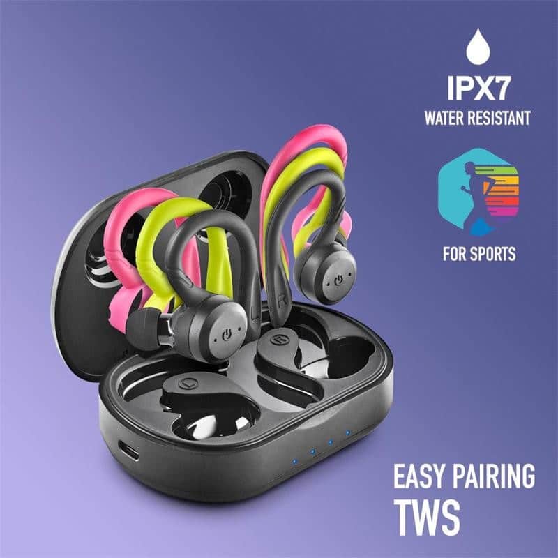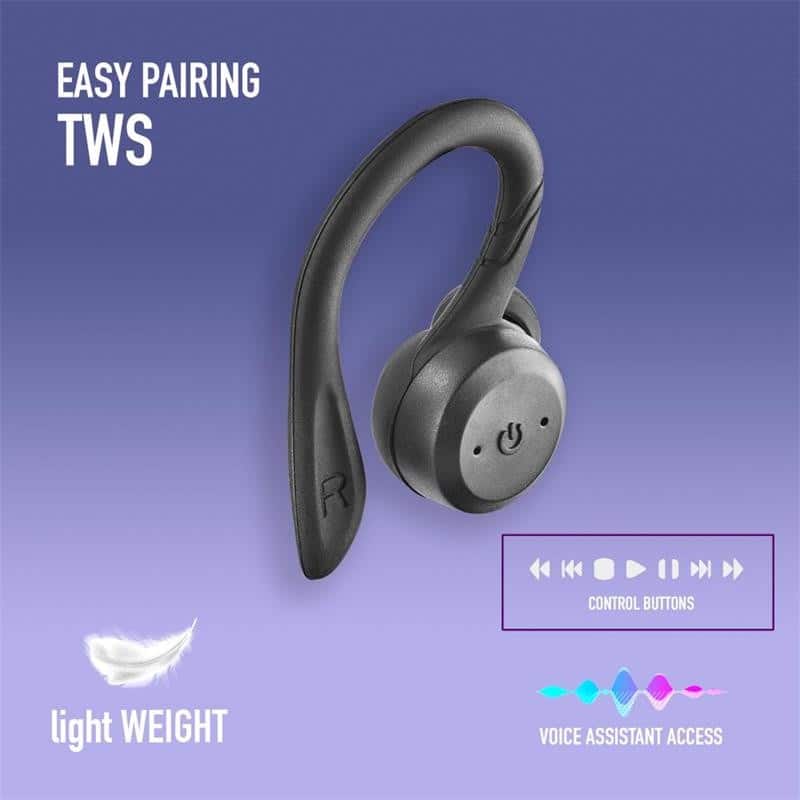 Auriculares inalámbricos compatibles con la tecnología True Wireless Stereo y Bluetooth 5.3. Resistentes al agua nivel IPX7, que los protege del sudor y de la lluvia. Sujeción de gancho antideslizante para una fijación extrema a la oreja.