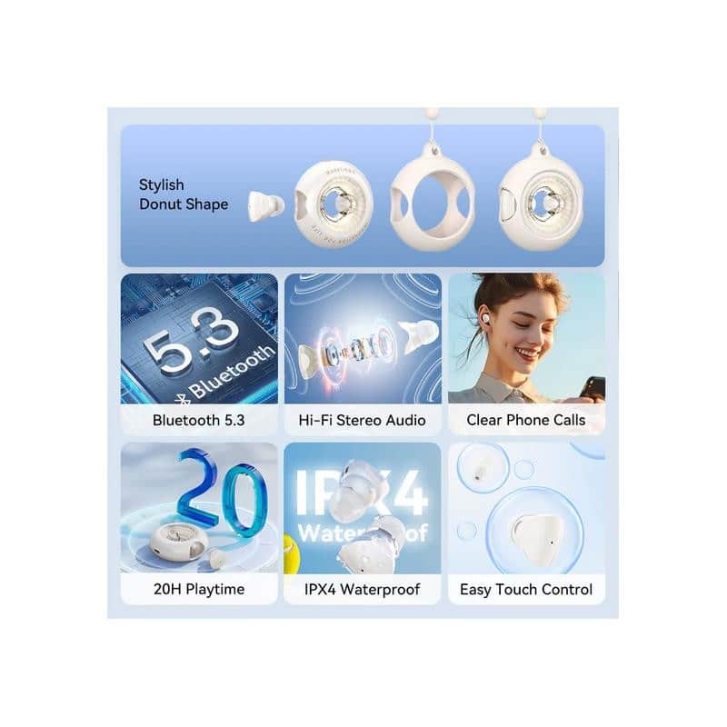 Auriculares Bluetooth con diseño innovador en forma de dona, sonido potente y luz ambiental, ideales para un estilo moderno, comodidad duradera y llamadas nítidas.