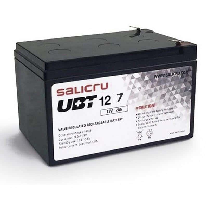 Características Las baterías de la serie UBT de Salicru son acumuladores de energía altamente potentes y compactos, basados en sistemas recargables de plomo-dióxido de plomo, y son especialmente óptimos para las aplicaciones de Sistemas de Alimentacion Ininterrumpida SAI/UPS y otros sistemas de seguridad que requieren de un back-up de energía fiable y de calidad.La gama de baterías UBT de Salicru incluye el modelo de 7 Ah, todos a 12 V.El electrolito de cido sulf rico se encuentra absorbido por los separadores y placas. Y stas a su vez inmovilizadas. Est n dise ñados utilizando la tecnología de recombinación de gas que elimina la necesidad para la adición regular de agua mediante el control de la evolución de hidrógeno y oxígeno durante la carga.