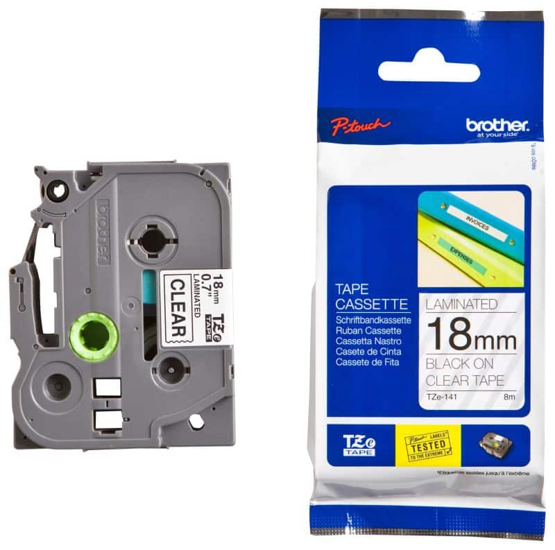 BROTHER CINTA LAMINADA TZE-141 18MM TEXTO NEGRO SOBRE FONDO TRANSPARENTE. ANCHO: 18 MM. LONGITUD: 8 M.