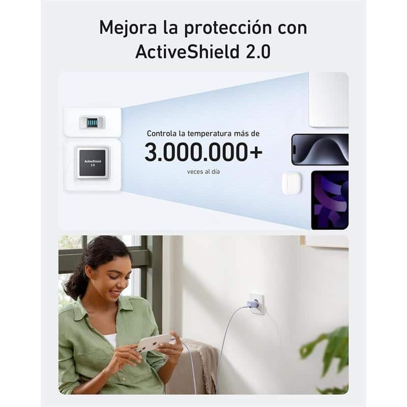 Protección de carga con Active Shield 2.0: la tecnología de carga patentada de Anker protege tus dispositivos mediante el monitoreo inteligente de la temperatura de carga más de 3 millones de veces al día, que es el doble de veces en comparación con ActiveShield 1.0.