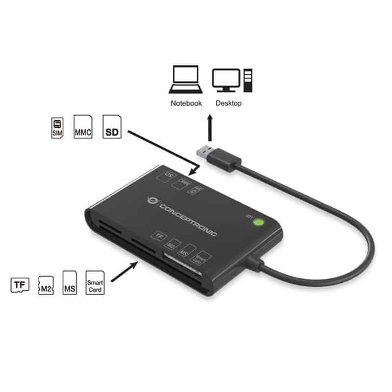 CONCEPTRONIC LECTOR DE TARJETA Y DNI BIAN01B NEGRO. 5 milímetros Características Conecta y reproduce: sí Tarjetas de memoria compatibles: MMC Diseño Color del producto: Negro…