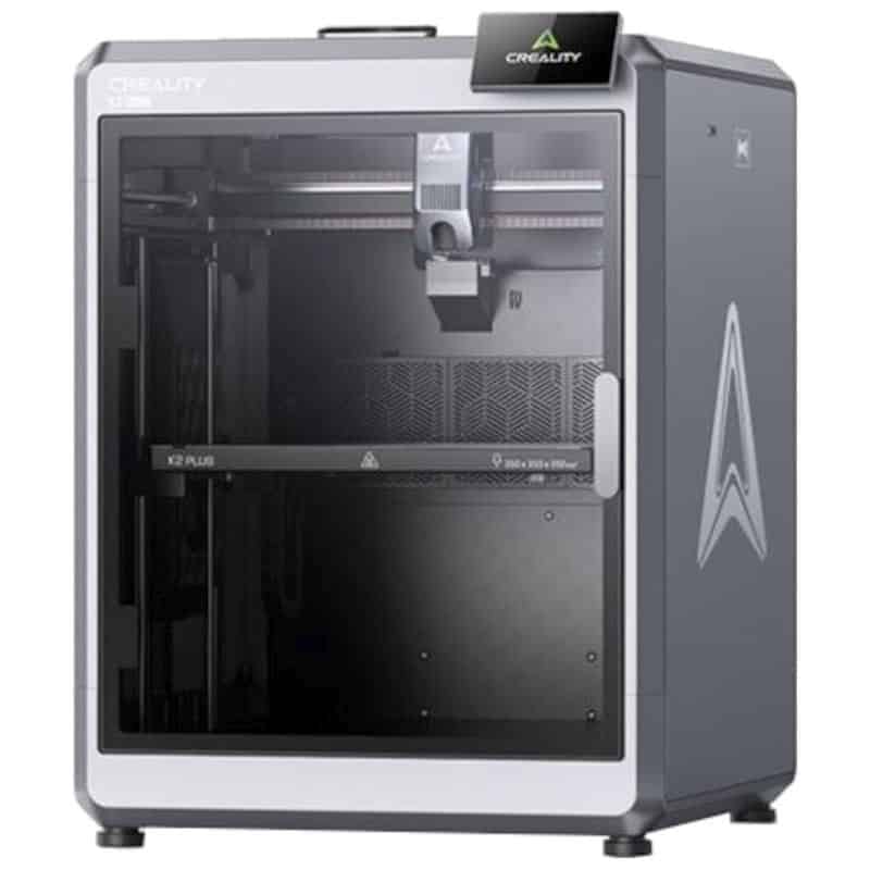 Creality K2 Plus – Gran Tamaño Multifilamento hasta 4 CFS (16 colores) – Alta velocidad 600mm/s, Tamaño de impresión 350x350x350mm – Impresora 3D FDM Creality K2 Plus, impresora 3D con tamaño de impresión de 350mm , sistema CFS de hasta 16 colores y velocidad de impresión de 600mm/s, en color negro Velocidad de impresión de 600mm/s – Tamaño de impresión de 350 x 350 x 350mm – Sistema inteligente CFS con hasta 16 colores – Cámara calefactada activamente – Estructura robusta Matrix – Ethernet + WiFi – Purificador de aire – 32 GB de almacenamiento ROM La Creality K2 Plus es una impresora 3D robusta con amplio tamaño y gran velocidad de impresión. Cuenta con un sistema inteligente CFS que permite imprimir hasta en 16 colores gracias a la compatibilidad con hasta 4 rollos de filamento y su volumen de construcción es de 350 x 350 x 350mm. Además, se distingue por su funcionamiento silencioso incluso imprimiendo a toda velocidad, que puede alcanzar los 600 mm/s.