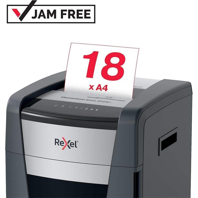 • Las destructoras de papel sin atascos Rexel Momentum Extra son ideales para destruir documentos confidenciales en la oficina. La destructora XP418+ destruye hasta 18 hojas de papel A4 (80 grs) de una sola vez a través de la ranura de alimentación manual en partículas P-4 (4x35mm). La tecnología de detección activa mide el número de hojas que se alimentan en tiempo real para detener los atascos y los errores de alimentación del papel