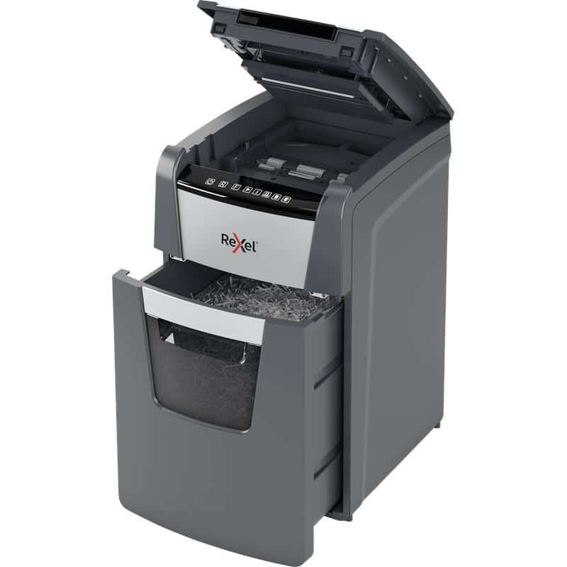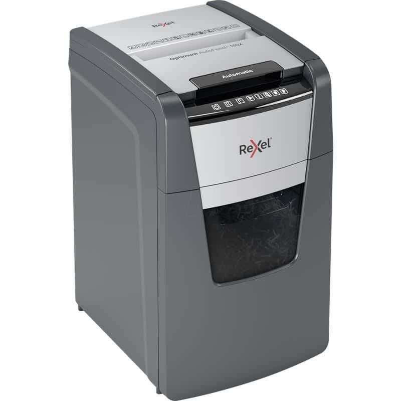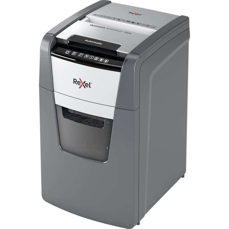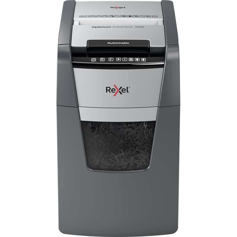 La destructora de corte en partículas Optimum AutoFeed 150X tritura automáticamente hasta 150 hojas de papel A4 (80 grs.) a la vez, en partículas P-4 (4×28 mm).