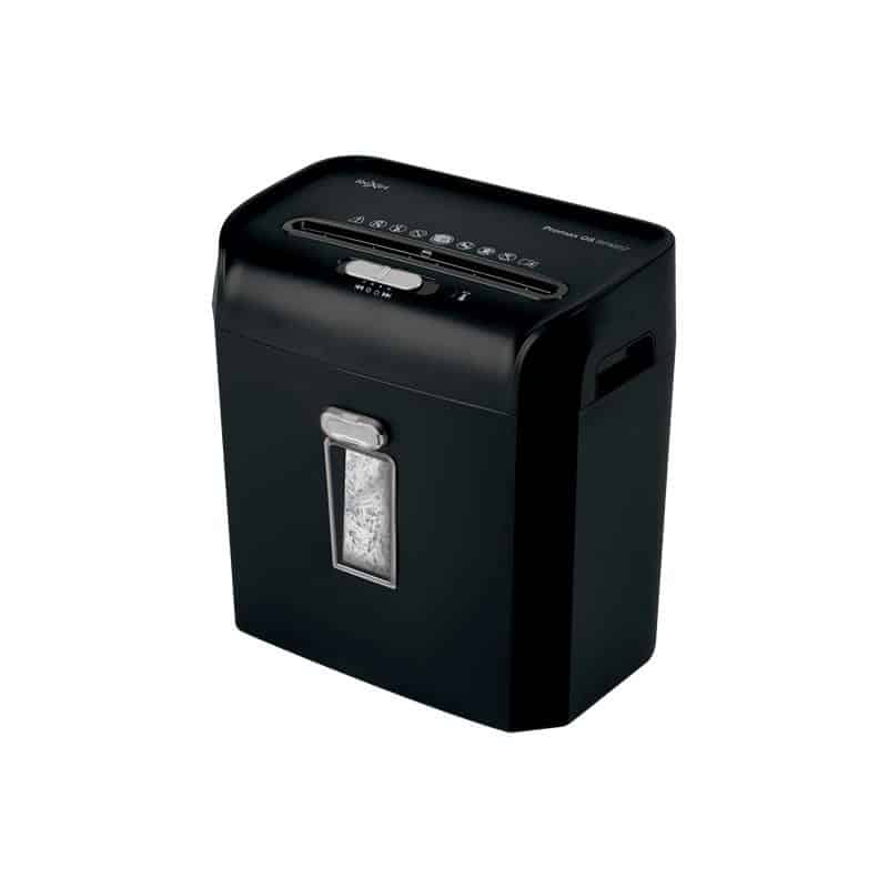 Con una ventana transparente en la papelera para ver cuando está llena. Destruye grapas, clips y tarjetas de crédito. 8 minutos de funcionamiento continuo.