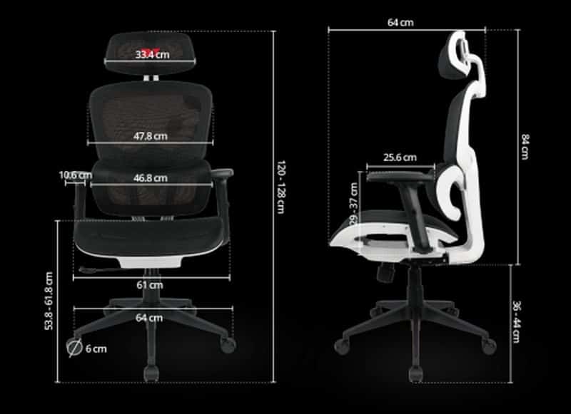 Material exterior: Malla de alta calidad Material interior: Estructura de polimero reforzado Reposabrazos: 2D pintados en negro con cojines de cuero de PU, alcolchado extra Base: Base de nylon negra de 64cm con ruedas de nylon negro Elevador: elevador de gas pintado en negro, 80mm, clase 4 Funciones: Inclinación, giro y funcion de bloqueo Cojines: lumbar y cervical integrados Dimensiones: 61 x 120-127 x 64cm (An x Al x Pr) Colores: Blanco, negro y rojo Peso: 14.3 KG