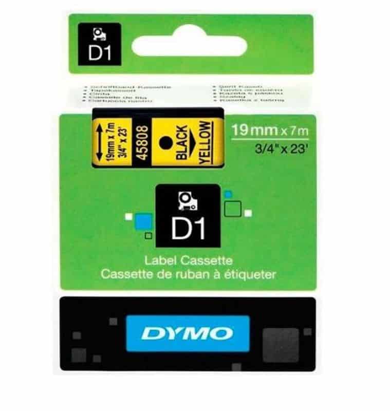 ETIQUETAS ESTÁNDAR NEGRO SOBRE AMARILLO DE 19MMX7M DE PLASTICO. todas las impresoras/marcadores DYMO LabelManager todas las impresoras/marcadores DYMO LabelPoint todas las impresoras DYMO LabelWriter DUO todas las impresoras/marcadores de etiquetas que aceptan cartuchos de etiquetas D1