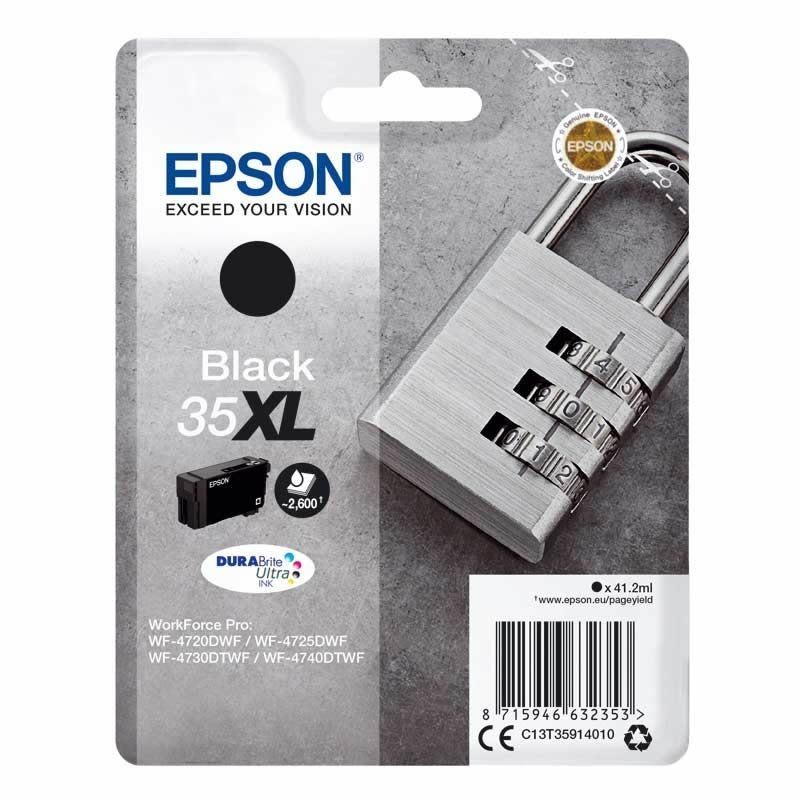 Cartucho de tinta de alta capacidad de color negro Epson T3591 (35XL). Cartucho original de Epson. Este cartucho dura aproximadamente 2.600 páginas ya que contiene 41,2 ml. de tinta. Con este cartucho lograra la máxima calidad de impresión posible para su impresora. Epson WorkForce Pro WF 4700 Epson WorkForce Pro WF 4720 Epson WorkForce Pro WF 4720 DWF Epson WorkForce Pro WF 4725 DWF Epson WorkForce Pro WF 4730 DTWF Epson WorkForce Pro WF 4735 DTWF Epson WorkForce Pro WF 4740 DTWF