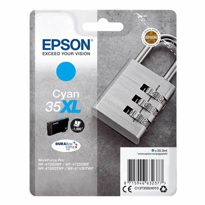 Cartucho de tinta de alta capacidad de color cian Epson T3592 (35XL). Cartucho original de Epson. Este cartucho dura aproximadamente 1.900 páginas ya que contiene 20,3 ml. de tinta. Con este cartucho lograra la máxima calidad de impresión posible para su impresora. Epson WorkForce Pro WF 4700 Epson WorkForce Pro WF 4720 Epson WorkForce Pro WF 4720 DWF Epson WorkForce Pro WF 4725 DWF Epson WorkForce Pro WF 4730 DTWF Epson WorkForce Pro WF 4735 DTWF Epson WorkForce Pro WF 4740 DTWF