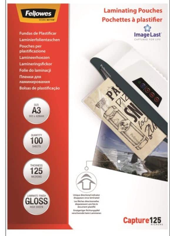FELLOWES FUNDAS PLASTIFICAR A3 125 MICRAS GLOSSY 100UD. FELLOWES PACK 100 FUNDAS PLASTIFICAR A3 125 MICRAS Categoría: Oficina > Consumibles > Originales Stock: 66 ud.