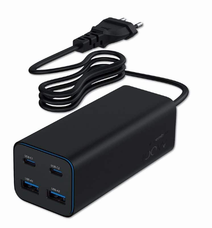 Cargador rápido USB PowerDelivery GaN de 4 puertos y 100 W, negro 100 W de potencia para su smartphone o portátil Puerto Type-C o puerto USB estándar para cargar rápidamente la mayoría de los smartphones Compatible con el protocolo de carga rápida USB PD y QC 3.0 La tecnología GaN permite un diseño energéticamente eficiente más compacto Cargador rápido USB de 4 puertos y 100 W: compatible con las especificaciones QC 3.0 y PowerDelivery (PD) Tecnología GaN: diseño compacto y mayor eficiencia energética Los puertos tipo C admiten hasta 100 W PD, los puertos tipo A admiten 30 W QC 3.0 Protección inteligente contra sobrecorriente, sobretensión, cortocircuito y sobrecalentamiento Práctico cable de alimentación de CA Especificaciones Tensión de entrada: 100 V – 240 V ~, hasta 2,0 A USB-C1: 5,0 V? 3,0A, 9,0V? 3,0A,12,0V?