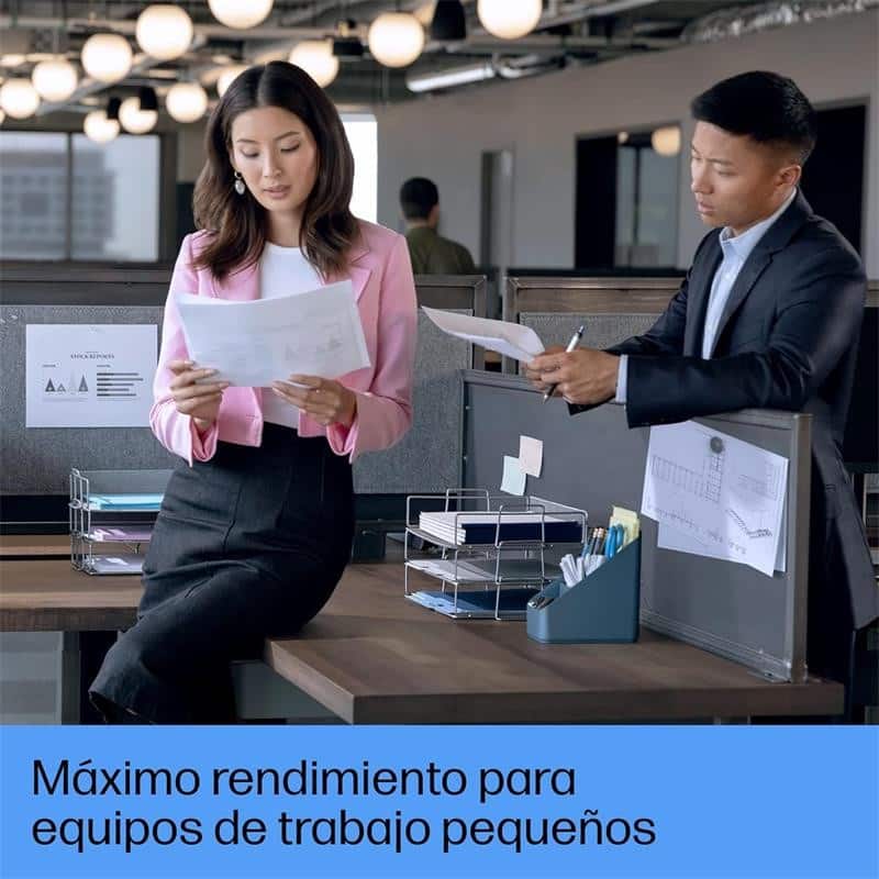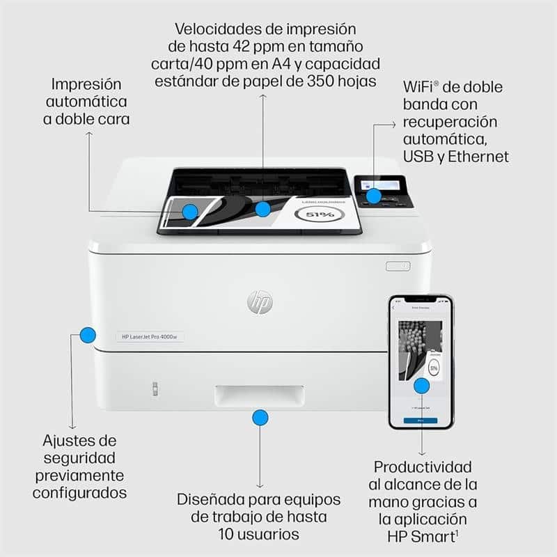 Impresora HP LaserJet Pro 4002dw Esta impresora se ha diseñado para ofrecer la máxima productividad gracias a la fiabilidad del hardware ya las rápidas velocidades que alcanza. Utilízala fácilmente desde donde trabajas para que puedas centrarte en tu actividad comercial. Especificaciones Velocidad de impresión en blanco y negro (ISO, A4): Hasta 40 ppm 1 1 ([7] Medido con ISO/IEC 24734, excluye el primer conjunto de documentos de prueba.