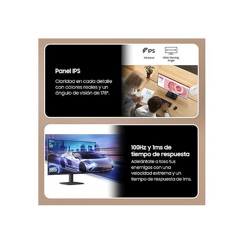 Colores fuertes en toda la pantalla Panel IPS Experimente el esplendor del color, sin importar el ángulo. El panel IPS garantiza una reproducción detallada del color y una claridad brillante de la pantalla. Los tonos y sombras de color se muestran consistentemente sin que los colores parezcan descoloridos.