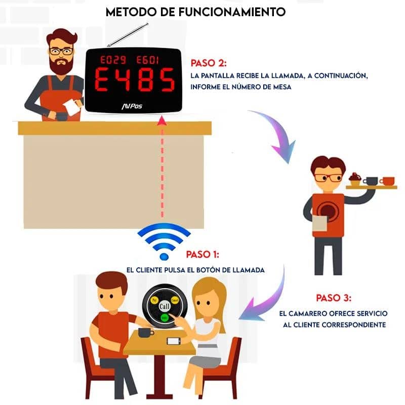 La Pantalla Receptora de Avisos Clientes AVPos SR01 es la solución perfecta para optimizar el servicio en tu restaurante. Permite a tus clientes llamar al camarero de forma sencilla, ya sea para solicitar agua, hacer un pedido o pedir la cuenta. Cuando el cliente presiona el dispositivo, se envía un aviso al camarero indicando la mesa correspondiente.