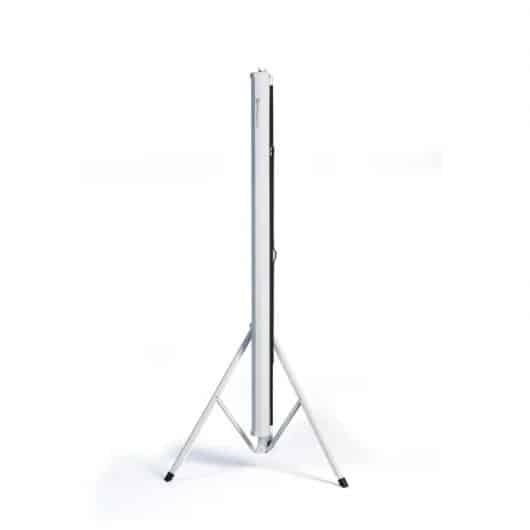 La base del trípode es de metal para garantizar una máxima estabilidad. Ofrece la posibilidad de ajustarse en altura lo que hace que se adapte perfectamente a cualquier lugar de proyección. La zona blanca proyectable más el margen negro mide 1.51 x 1.53 m, la anchura de la carcasa es de 1,51 metros y el trípode 53 cm.