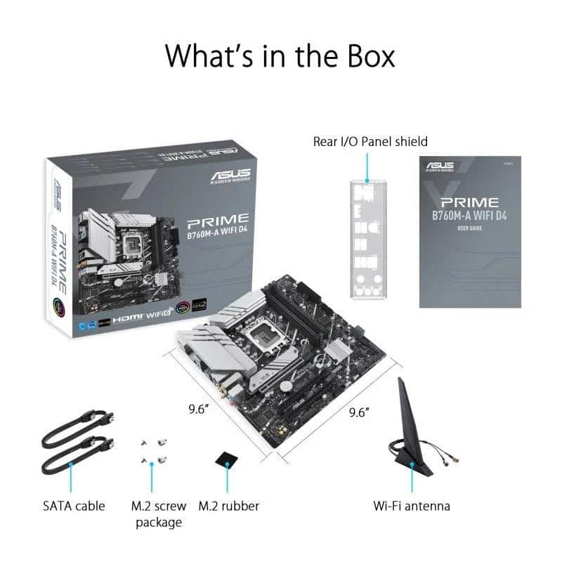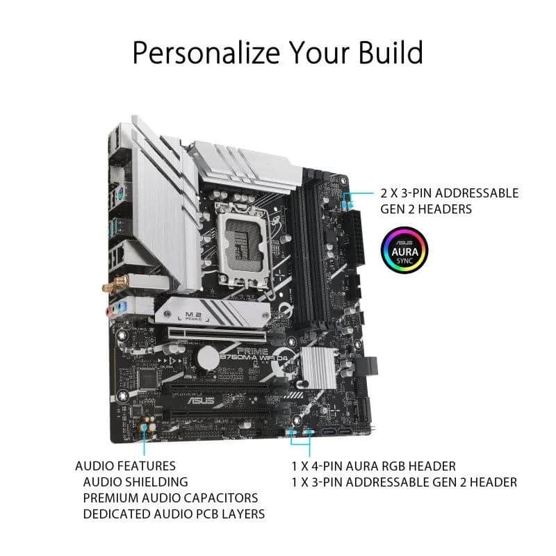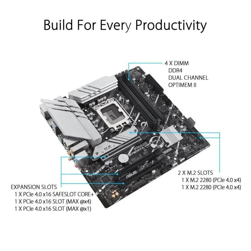 Placa base Intel B760 (LGA 1700) mATX, PCIe 4.0, dos ranuras M.2, Realtek 2.5Gb Ethernet, Wi-Fi 6, DisplayPort, Dual HDMI , SATA 6 Gbps, USB 3.2 Gen 2 posterior, USB 3.2 Gen 1 frontal Tipo-C , Aura Sync Zócalo Intel LGA 1700: Listo para procesadores Intel de 13. y 12. generación Conectividad ultrarrápida: PCIe 4.0, dos ranuras M.2, Realtek 2.5Gb Ethernet, Wi-Fi 6, USB 3.2 Gen 2 posterior, USB 3.2 Gen 1 Type-C frontal Refrigeración integral: disipadores de calor VRM, disipador de calor M.2, disipador de calor PCH, encabezados de ventilador híbrido y Fan Xpert 2+ ASUS OptiMem II: enrutamiento cuidadoso de trazas y vías, además de optimizaciones de capa base para preservar la integridad de la señal para mejorar el overclocking de la memoria Iluminación Aura Sync RGB: encabezados Gen 2 direccionables integrados y encabezado Aura RGB para tiras de LED RGB, sincronizados fácilmente con hardware compatible con Aura Sync B760M-A WIFI D4 Las placas base de la serie ASUS Prime están diseñadas po