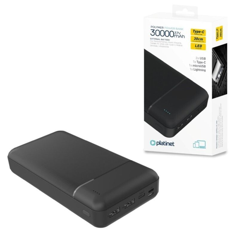 – Modelo: PMPB30W707B – Marca: Platinet – Color: Negro – Capacidad: 30000mAh – Tiempo de carga: 5h – Imput: microUSB DV 5V/2.1A y Type-C DC 5V/2.1A – Batería: Polímero de litio de alta calidad – Salida USB: 2x5V, 1000mA y Ligthing DC 5V/2.1A