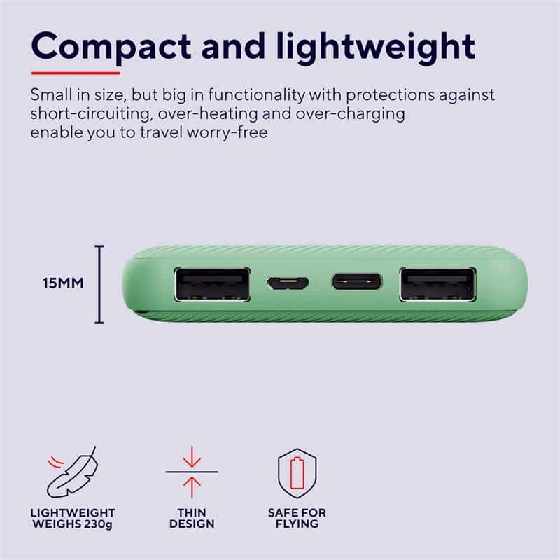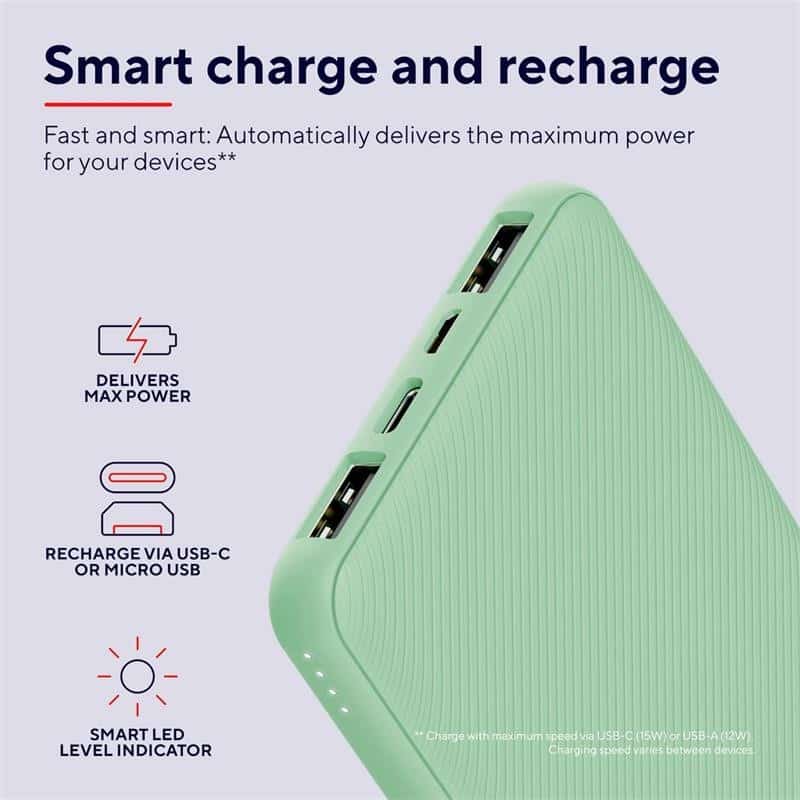 Pequeña en tamaño, pero grande en funcionalidad, la batería externa Primo ofrece una capacidad de 10 000 mAh en un diseño compacto que cabe fácilmente en cualquier bolsa. Con este compañero de viaje la conexión está garantizada siempre que se esté dando una vuelta; carga totalmente el teléfono hasta 4 veces y garantiza hasta 46 horas adicionales de batería de teléfono o 12 horas adicionales en el caso de la tableta.* *Depende de la marca y del modelo y del estado de la batería. Meramente indicativo