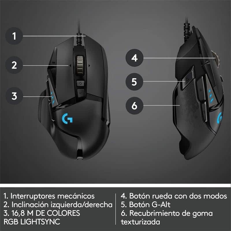 G502 HERO Concebido para un rendimiento de gaming avanzado. El G502 HERO cuenta con el sensor para gaming HERO 25K con seguimiento de precisión submicrónico, RGB LIGHTSYNC, perfiles integrados, pesos reposicionables y mucho más. HERO DE NUEVO G502 HERO dispone de un sensor óptico avanzado para máxima precisión de seguimiento, iluminación RGB personalizada, perfiles de juego personalizados, de 200 a 25.600 dpi y pesas reposicionables.