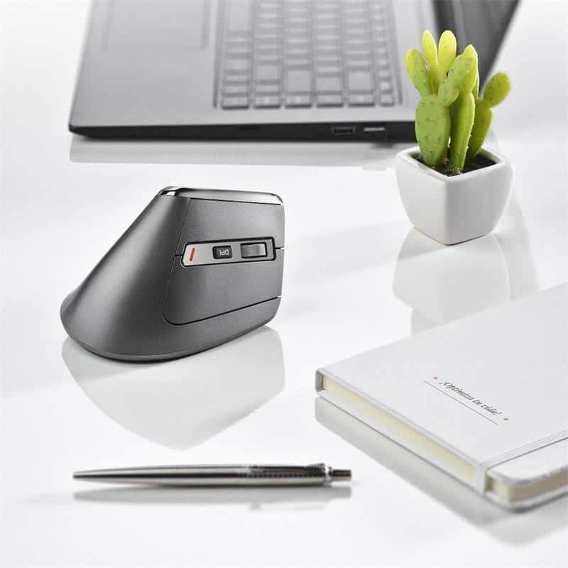 Este ratón vertical cuenta con 5 botones y una rueda de desplazamiento.