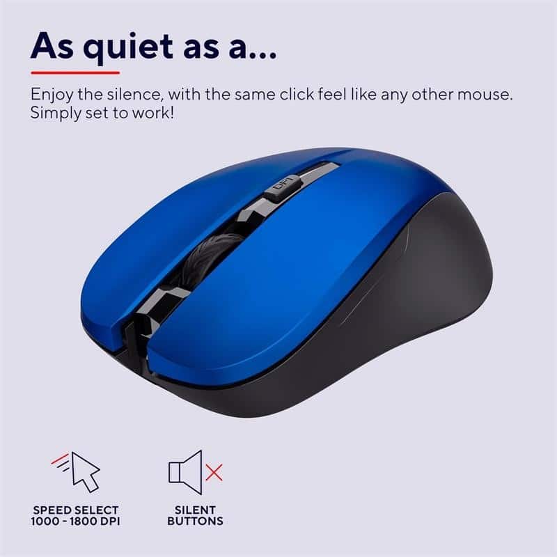 Cómodo ratón inalámbrico Mydo Silent Click de Trust con modernas teclas silenciosas, en color azul.