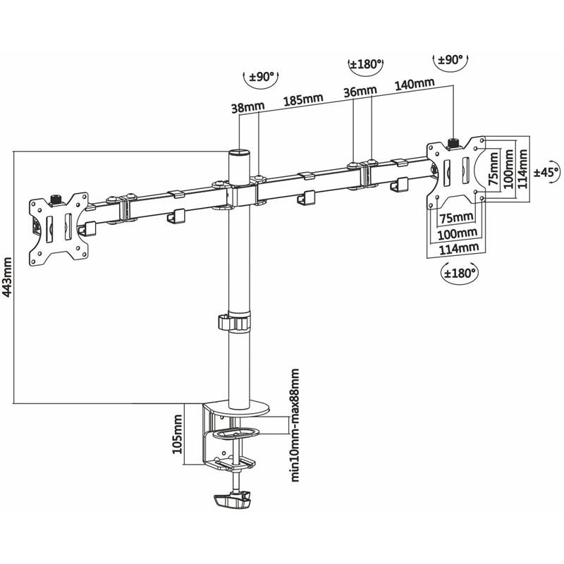 Especificaciones Soporte de mesa eco giratorio e inclinable para monitor/TV (3 pivotes, 2 brazos) de 13?-32? Fabricado con acero de alta resistencia y pintado con pintura electrostática para un acabado perfecto. Se permite la instalación en la mesa a través de abrazadera o de tornillo pasante VESA Máximo: 100x100mm (Compatible con VESA de 75 75, 100x100mm) Carga Máxima: 8kg / Brazo Angulo de Inclinación: -45 / +45 (depende de la instalación y del espacio disponible) Angulo máximo de giro: 360 (depende de la instalación y del espacio disponible) Ángulo máximo de rotación: 180 (depende de la instalación y del espacio disponible) Sistema de gestión de cables: dispone de unos ganchos para poder agrupar los cables.