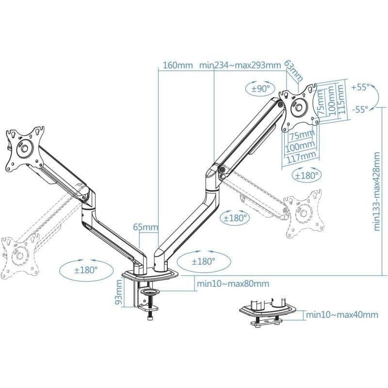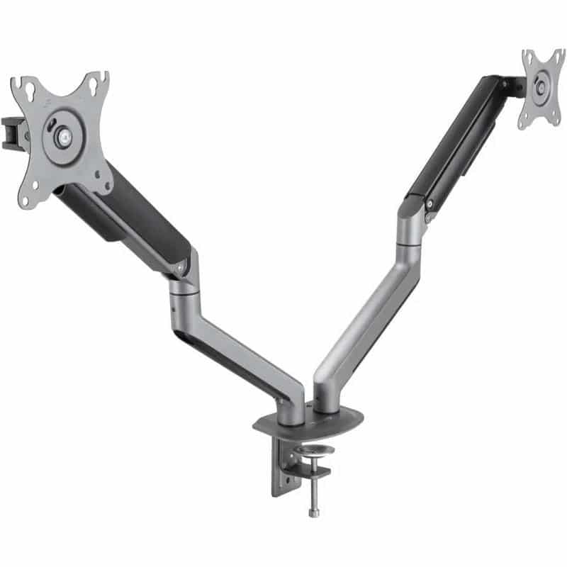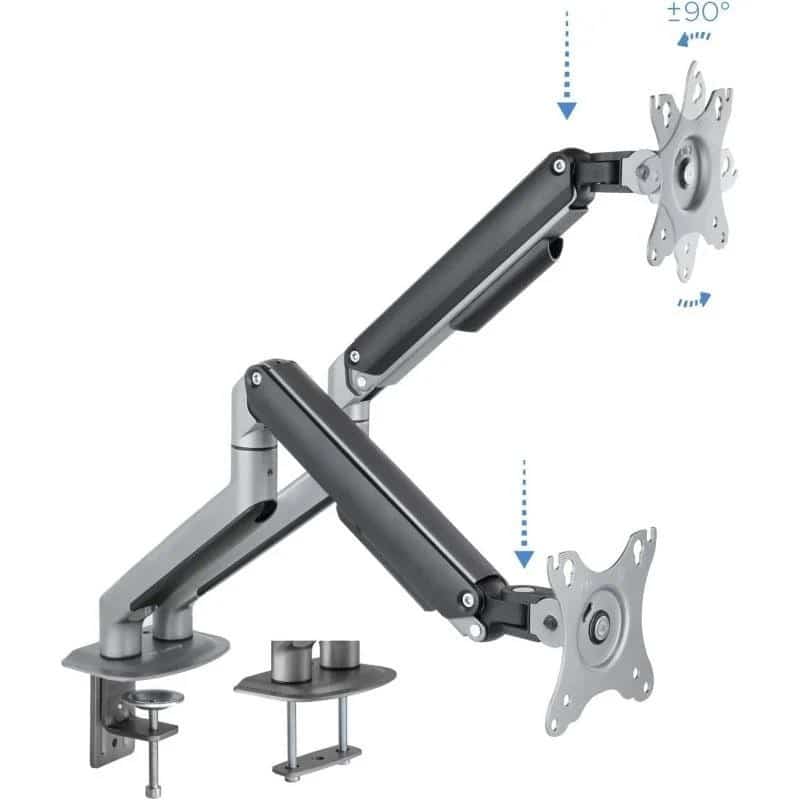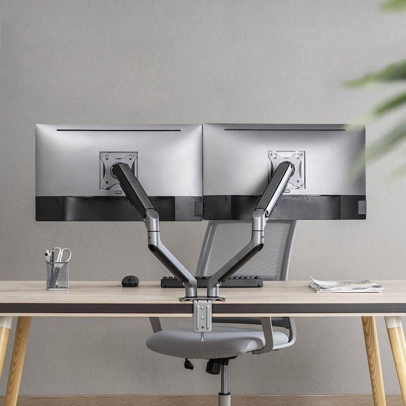 Soporte de mesa para 2 pantallas 17″-32″ cuenta con dos sistemas de montaje, elige el que mejor quede en tu escritorio, ambos son sencillos y muy estables.
