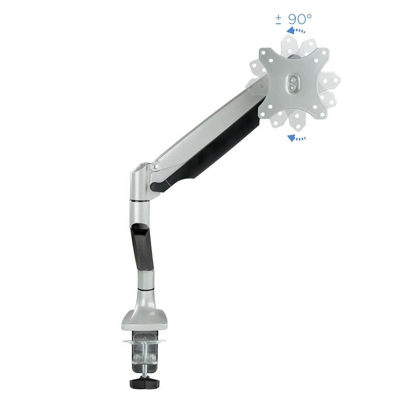 Especificaciones: Soporte de mesa orientable para pantalla (monitor / plasma / LCD / LED) de 13″» a 32″» (depende de la instalación y del espacio disponible) con 3 puntos de giro VESA: 75x75mm y 100x100mm Pantallas soportadas: 13″»-32″» Carga Máxima: 9kg ángulo de Inclinación: -90 / +90 ángulo máximo de giro: 360 (depende del tamaño de la pantalla, de la instalación y del espacio disponible) ángulo máximo de rotación: 180 Brazo articulado con pistón de gas Material: Aluminio Color: Plata Contenido del Paquete 1 x Soporte 1 x Kit montaje (No incluye herramientas) 1 x Manual de instalación