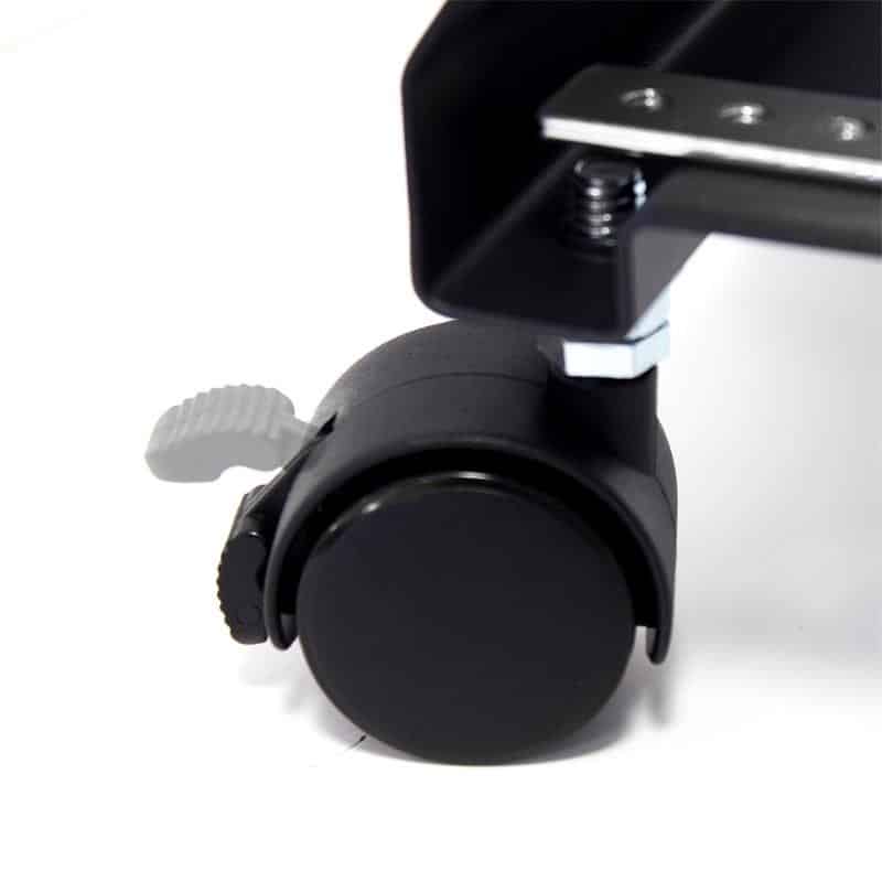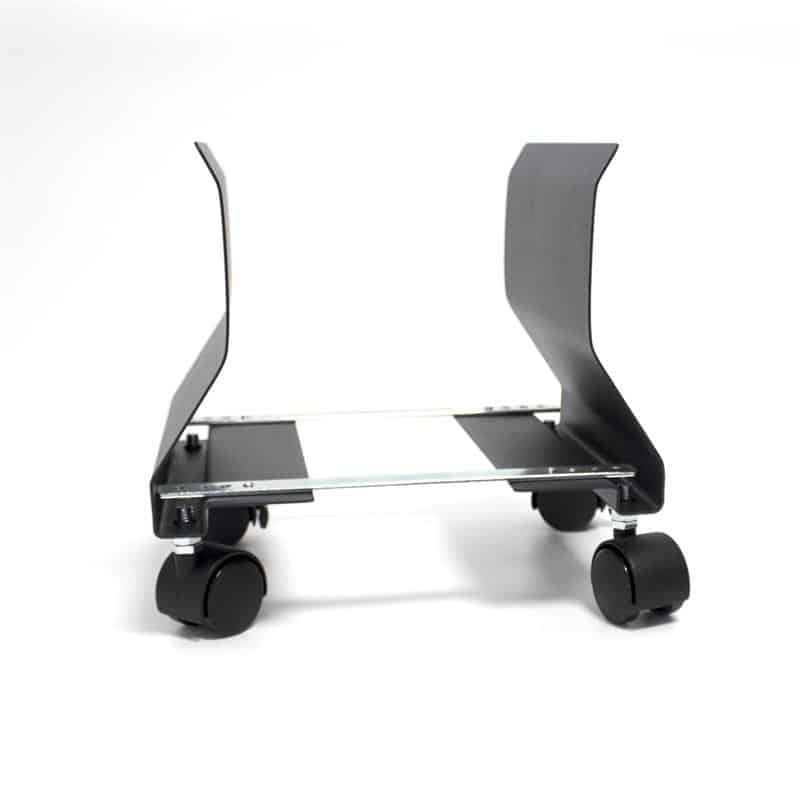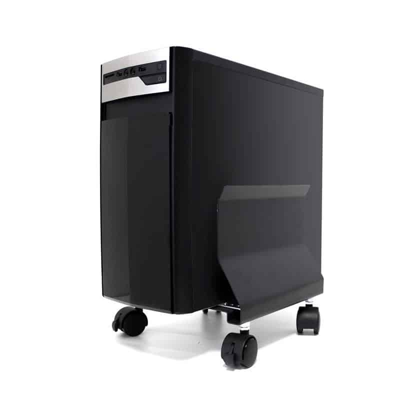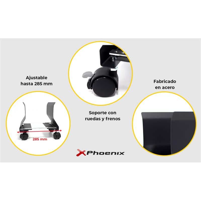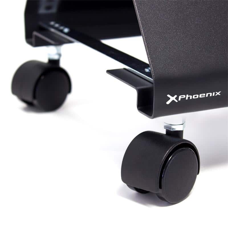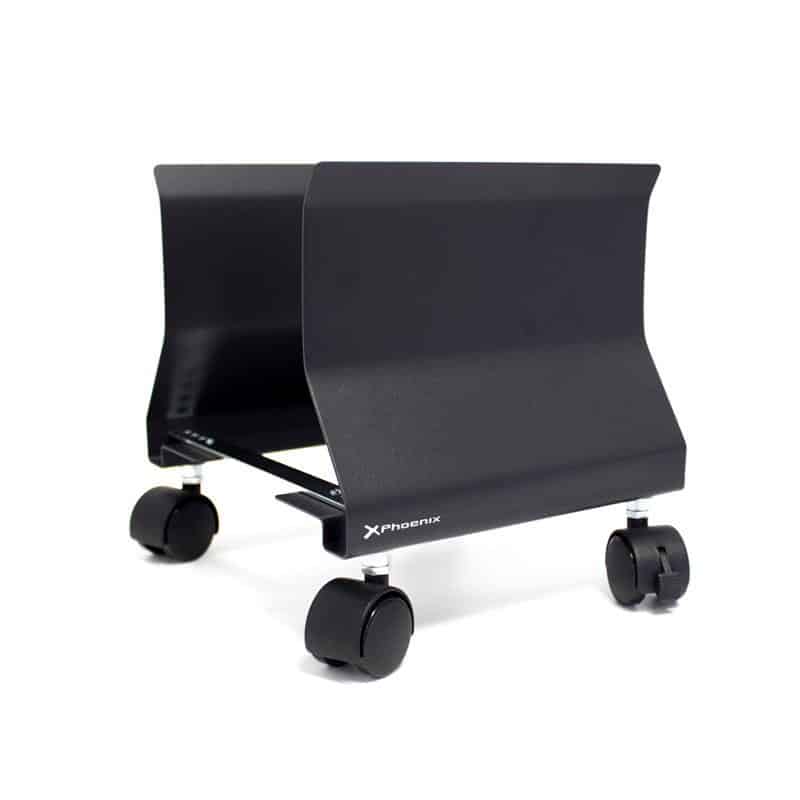 Perfecto soporte resistente Phoenix para ordenadores con ruedas de color negro.