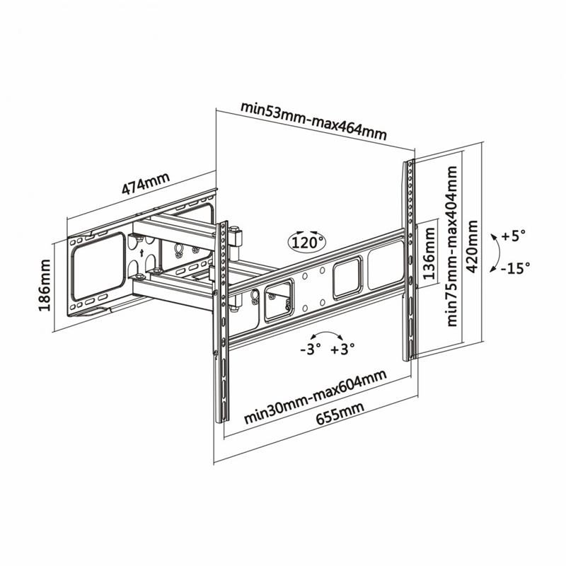 Profundidad ajustable: Si Ángulo de inclinación: -15 – 5 Ángulo de rotación: 60 Distancia a la pared (max): 46,4 cm Distancia a la pared (min): 5,3 cm Contenido del embalaje
