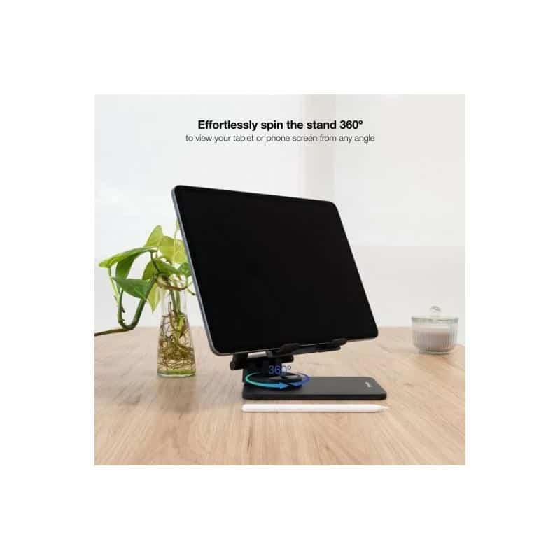 Diseño con rotación de 360 y multiángulo: El soporte adopta un diseño ergonómico, giratorio 360 , se puede ajustar en altura y ángulo libremente. Perfecto para ver películas, jugar videojuegos o hacer vídeo conferencias.