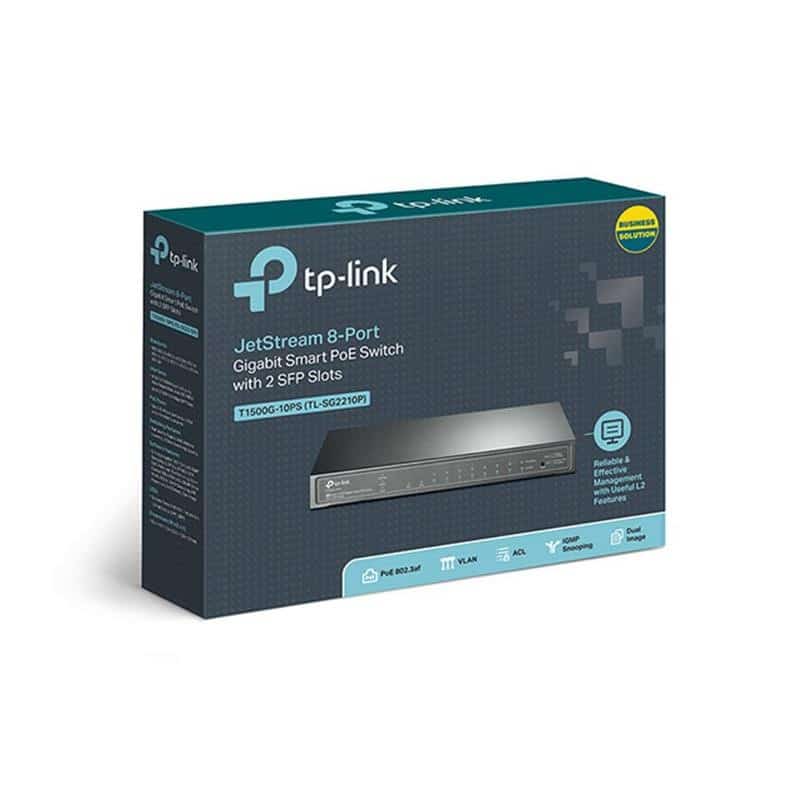El Smart Switch T1500G-10PS de TP-Link JetStream cuenta con 8 puertos RJ45 gigabits y 2 ranuras SFP, todos los puertos RJ45 admiten el estándar 802.