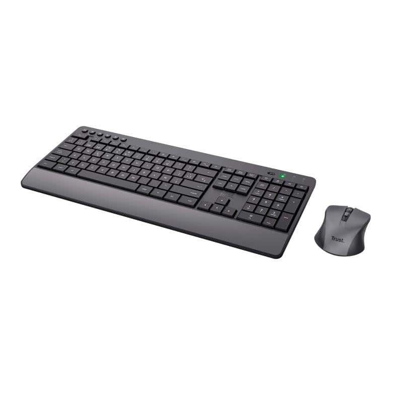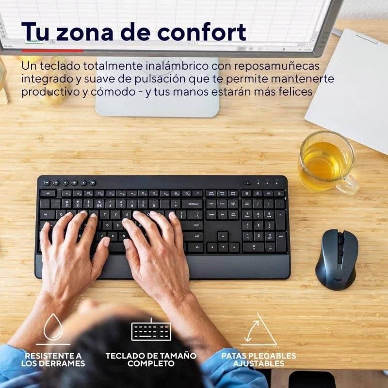 Teclado Y Mouse Trust Wireless Trezo Con Teclas Silenciosas Y Fabricado Con Material Reciclado Trust Trezo, Completo (100%), Inalámbrico, RF inalámbrico, QZERTY, Negro, Ratón incluido Cómodo set de teclado y ratón inalámbricos con teclas y botones silenciosos, fabricado con materiales reciclados. Teclear en silencio Trabaje cómodamente y en silencio con el pack de teclado y ratón Trezo Comfort, el teclado y ratón más silenciosos que jamás hayamos fabricado. Y cuando hablamos de silencio queremos decir silencio de biblioteca .