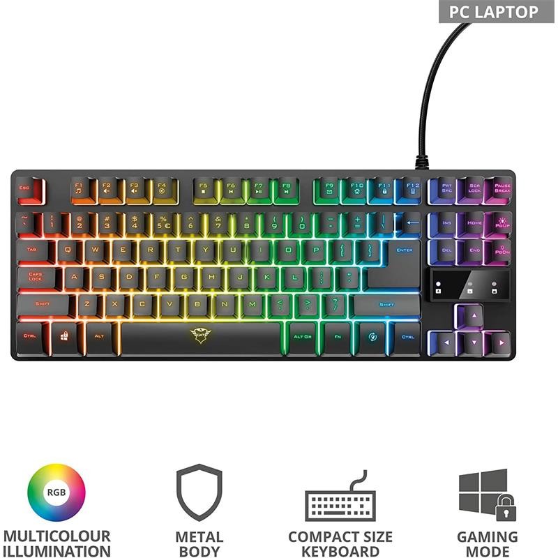 TRUST TECLADO GAMING GXT 833 THADO METALICO. lo que significa que solo ocupa el 80 % del espacio que ocuparía un teclado con un diseño de tamaño completo Las 12 teclas de acceso…