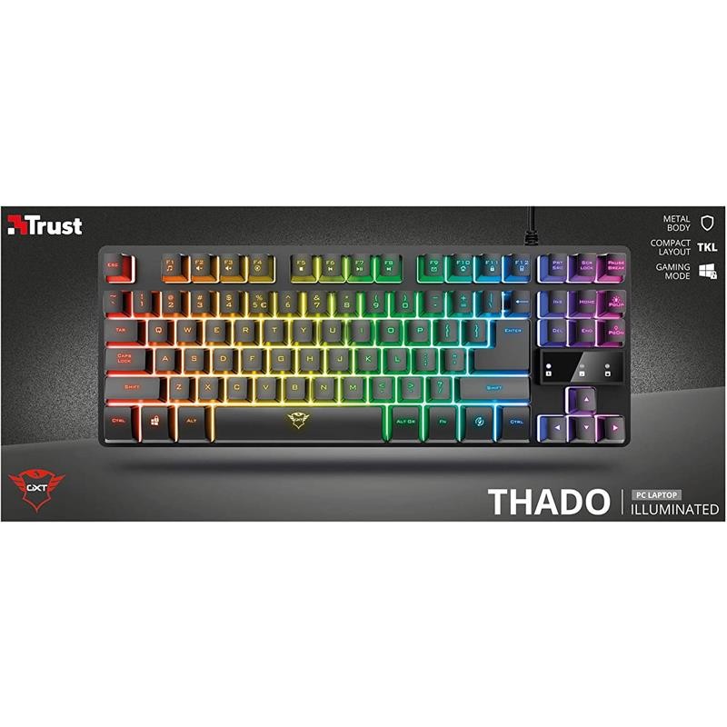 Teclado Trust Gaming Gxt 833 Thado Metalico Compacto Iluminacion Led Multicolor Anti-ghosting 12 Tecl.multimedia Usb 24067 Trust GXT 833 Thado, Tenkeyless (sin zona numérica) (80 – 87%), USB, Interruptor de membrana, Negro, Plata Más compacto, imposible Como gamer, solo te vale el mejor equipo para asegurarte el camino a la victoria. Pero si eres de los que se lleva el equipo a encuentros LAN, torneos o eventos, un factor de forma más pequeño puede serte útil. El GXT 833 Thado de Trust es un teclado gaming TKL.