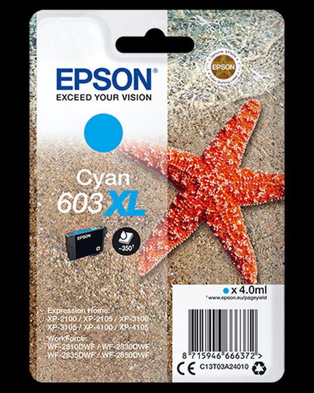EPSON CARTUCHO TINTA T03A2 CIAN N 603XL. EXPRESSION HOME: – XP-2100 – XP-2105 – XP-3100 – XP-3105 – XP-4100 – XP-4105 WORKFORCE – WF-2850DWF – WF-2835DWF – WF-2830DWF – WF-2810DWF…
