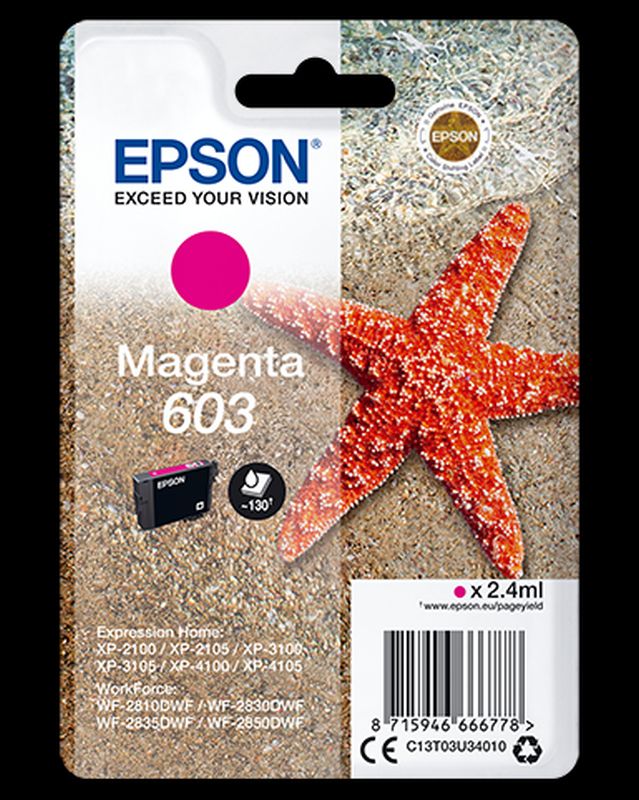 EPSON CARTUCHO TINTA T03U3 MAGENTA N 603. EXPRESSION HOME: – XP-2100 – XP-2105 – XP-3100 – XP-3105 – XP-4100 – XP-4105 WORKFORCE – WF-2850DWF – WF-2835DWF – WF-2830DWF -…