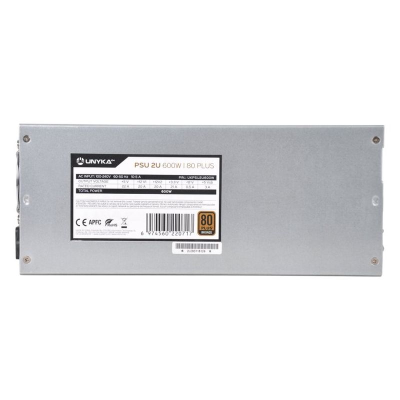 UNYKAch Fuente de Alimentación 2U 600W 80 Plus Bronce. Potencia total: 600 W, Voltaje de entrada AC: 100 – 240 V, Frecuencia de entrada AC: 50 – 60 Hz. Alimentador de energía para tarjeta madre: 24-pin ATX, Longitud del cable de alimentación de la placa base: 21 cm, Longitud del cable de alimentación SATA: 520 mm.