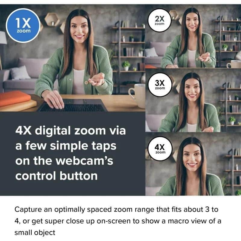 ZOOM DIGITAL 4X : se adapta a 3-4 personas en una presentación de grupo (predeterminado) a primeros planos súper ampliados (zoom 4X) para cuando necesite mostrar un objeto pequeño a otros en la llamada