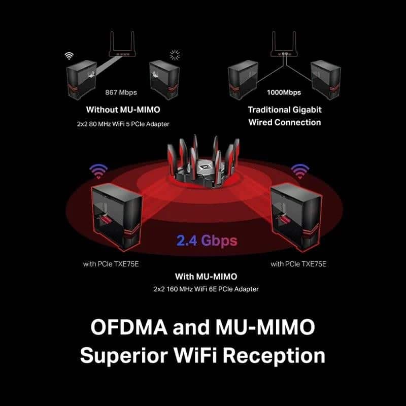Velocidad tribanda inigualable: aumenta las velocidades generales hasta 2402 Mbps (6 GHz) + 2402 Mbps (5 GHz) + 574 Mbps (2,4 GHz).