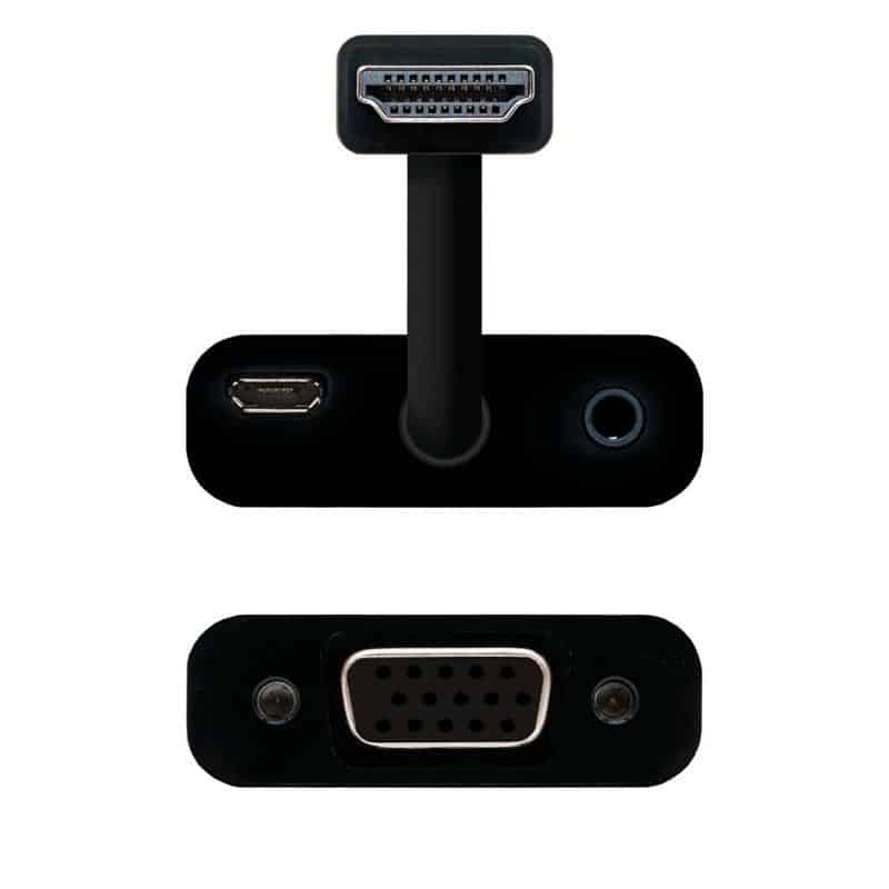 Conversor HDMI a SVGA y audio con conector HDMI macho en un extremo y conector D-sub HDB15 hembra y Jack 3.5 hembra en el otro. Permite al usuario conectar una pantalla VGA a un dispositivo equipado con salida HDMI, evitando el gasto de tener que actualizar el monitor por cuestiones de compatibilidad. Permite al usuario conectar una pantalla HDMI a un dispositivo VGA, consiguiendo la compatibilidad entre dispositivos.