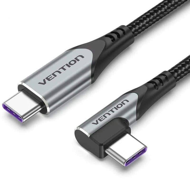 Cable USB 2.0 C a C macho con conector en ángulo recto, 5A, PD 100W, 480Mbps, trenzado de nailon, TPE, con chip E-Marker, blindaje de papel de aluminio y metal, color gris.