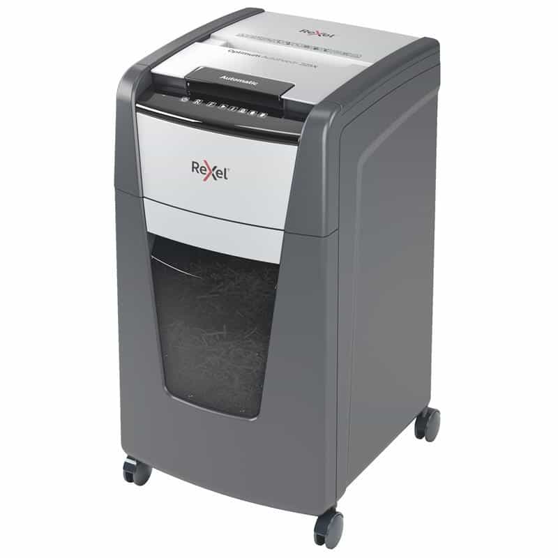 La destructora de corte en partículas Optimum AutoFeed 225X tritura automáticamente hasta 225 hojas de papel A4 (80 grs.) a la vez, en partículas P-4 (4×26 mm).